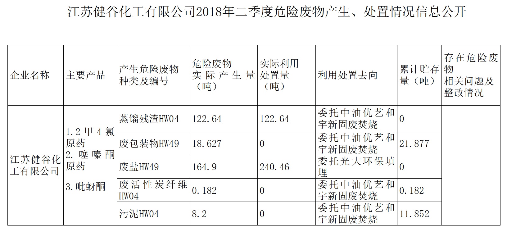 2018年二季度危险废物产生、处置情况信息公开